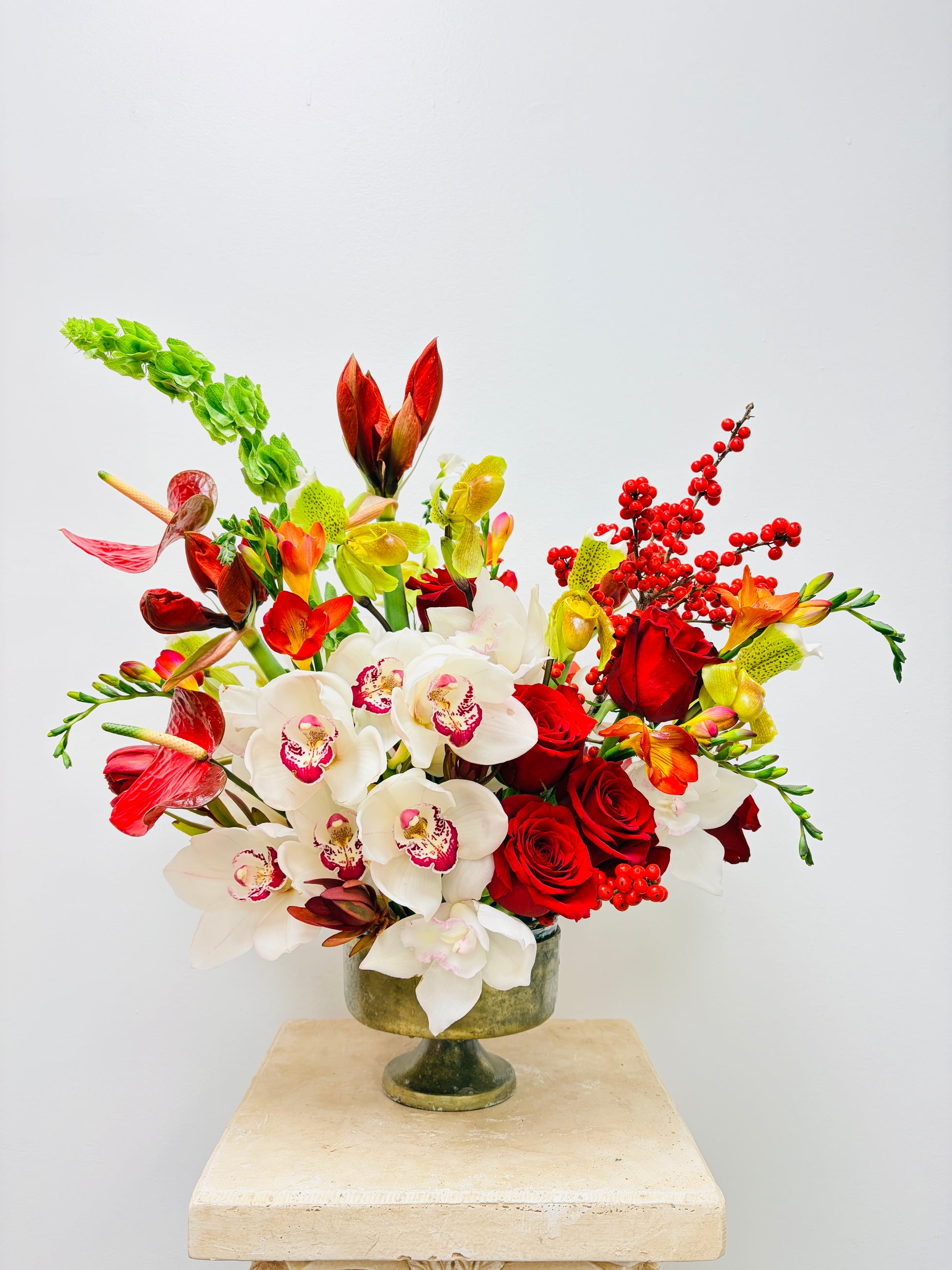 A bespoke masterpiece featuring regal white orchids and passionate red rose.